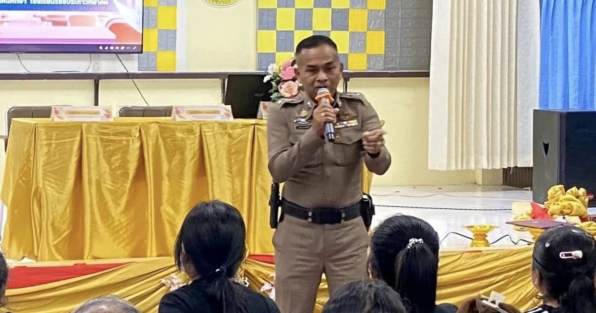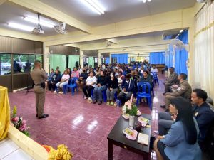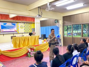 พ.ต.ท.ถาวร รามวงศ์ รอง ผกก.ป.สภ.บ้านตาขุน พร้อมด้วยสายตรวจตำบลเขาพังและสายตรวจจราจร บรรยายให้ความรู้ เรื่องกฎจราจร และโทษภัยของยาเสพติด
